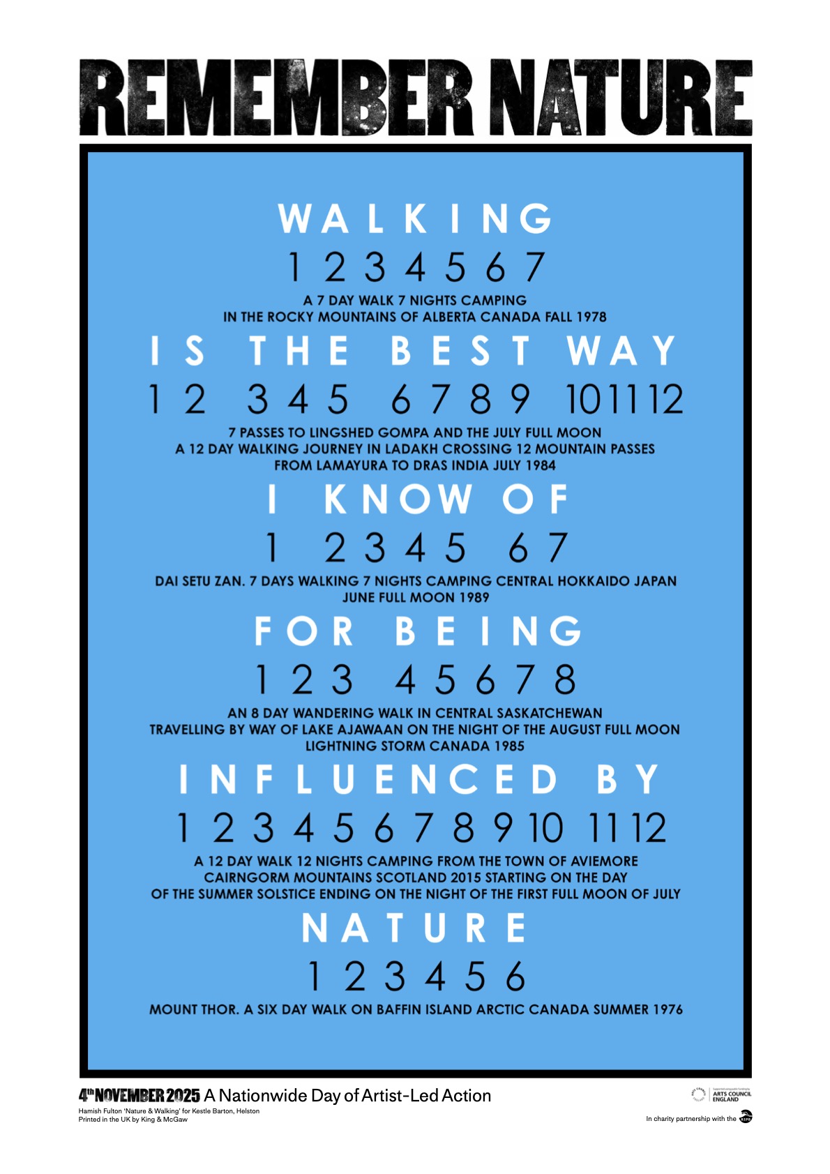 As our Lead Artist for the project, Hamish Fulton has designed a poster for the event (see image on left), along with making a two-minute film, a call to action to ‘remember nature’. Hamish Fulton will be organising a communal walk at Kestle Barton on the Day of Action on 4 November 2025.